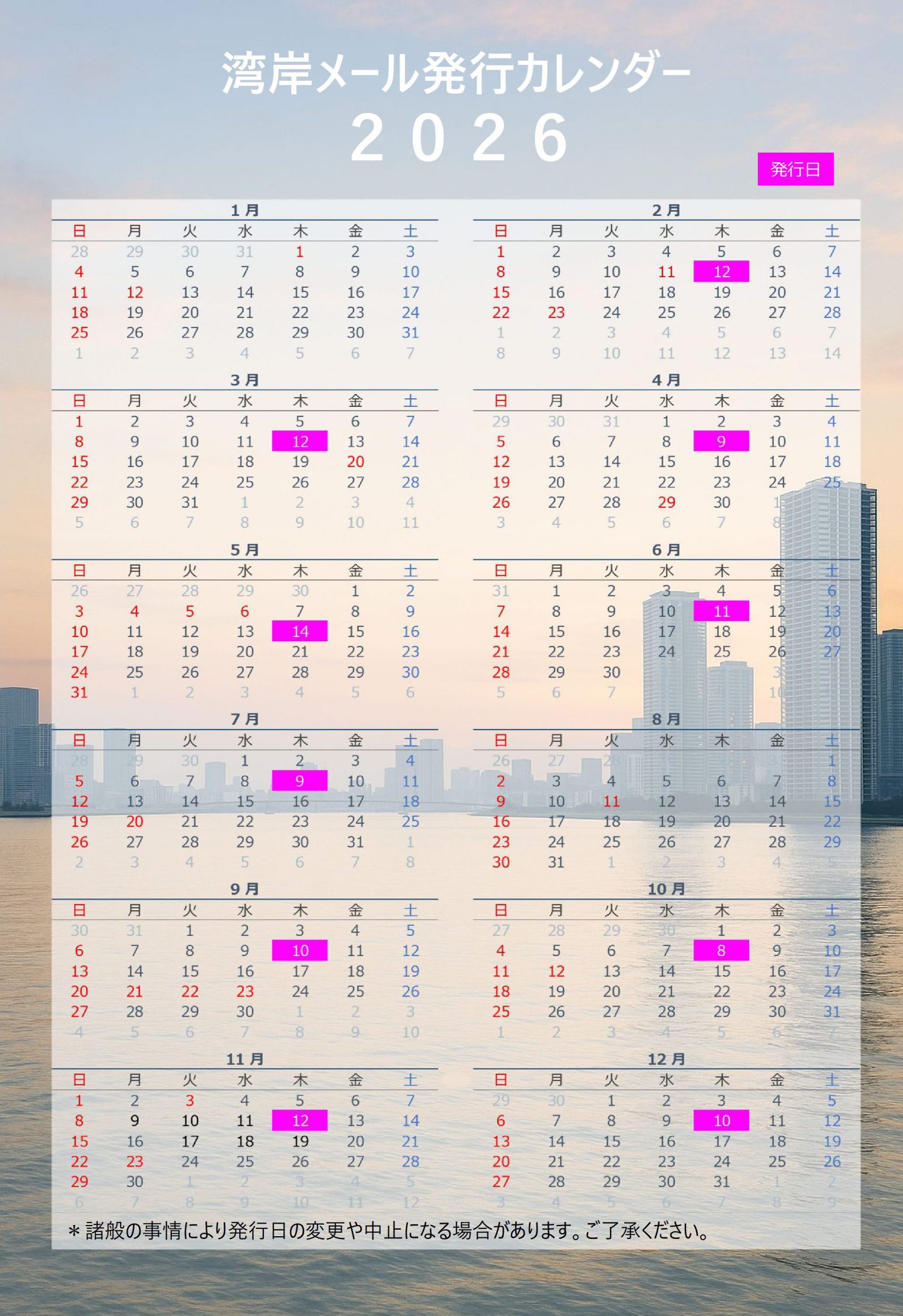 2026年湾岸メールの発行カレンダーです。おかげさまで来年は発行から8年目となります。今後もよろしくお願いいたします