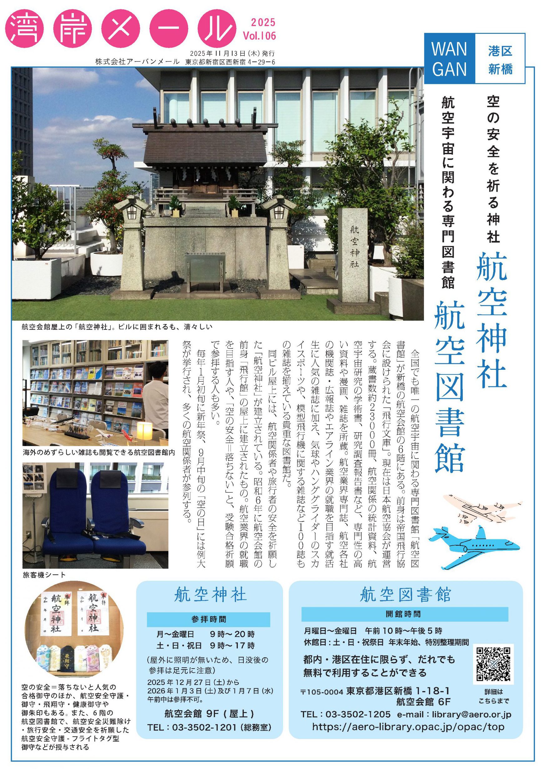 港区新橋にある「航空神社」は、空の安全を祈る全国唯一の神社として知られ、航空関係者や旅行好きな人々が多く参拝に訪れます。都会のビルに囲まれた屋上に鎮座し、秋空のもとで穏やかな時間が流れる隠れた癒しの場所です。隣接する「航空図書館」では、航空・宇宙に関する専門書籍や貴重な資料が充実。一般の利用も可能で、国内外の航空雑誌、旅客機の座席展示、歴史的パンフレットなど、飛行の魅力が詰まった空間となっています。空と人との関わりを感じる港区の小さな空の聖地を訪れてみてはいかがでしょうか。